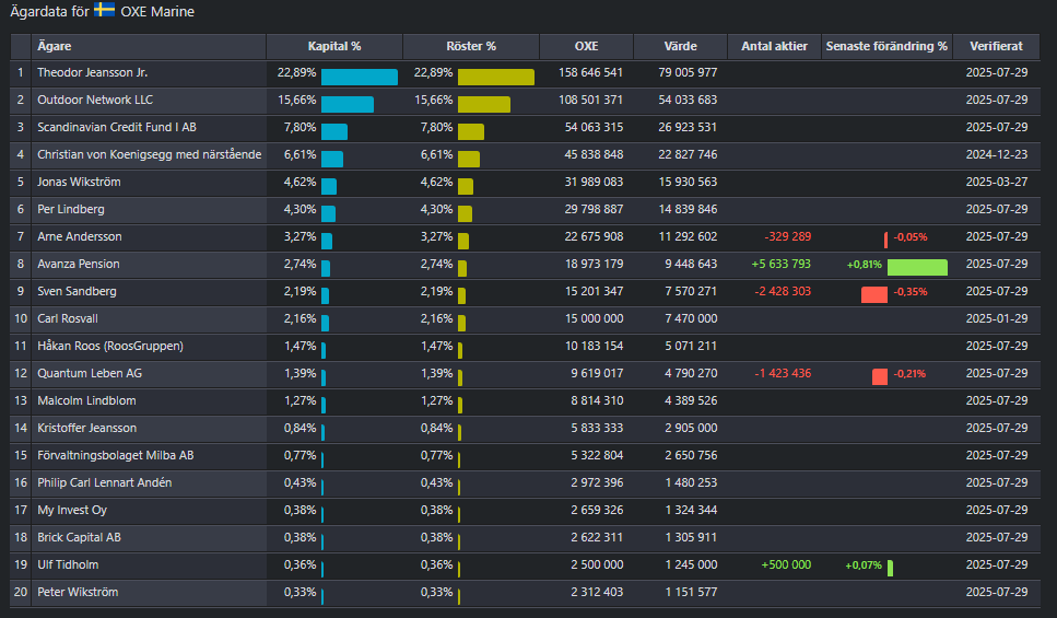 Ägarlistan per 2025-07-29. Notabla ägare: Theodor Jeansson, Christian Koenigsegg, Per Lindberg, Håkan Roos, Carl Rosvall.