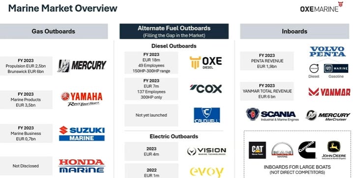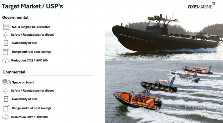 Men om den privata marknaden fortsätter med sina bensinalternativ så finns det klara skäl till att kommersiella aktörer ska välja en dieselutombordare. Marknaden för utombordare är gigantisk och allra störst är den amerikanska marknaden där OXE är ett starkt varumärke. Konkurrentsituationen är tuff med stora etablerade aktörer som Mercury, Yamaha, Volvo Penta mfl men av de stora aktörerna har enbart Mercury hittills gett sig in i marknaden för dieselutombordare. I Europa har ett brittiskt bolag (COX) utvecklat en egen dieselutombordare med V8-motorer.